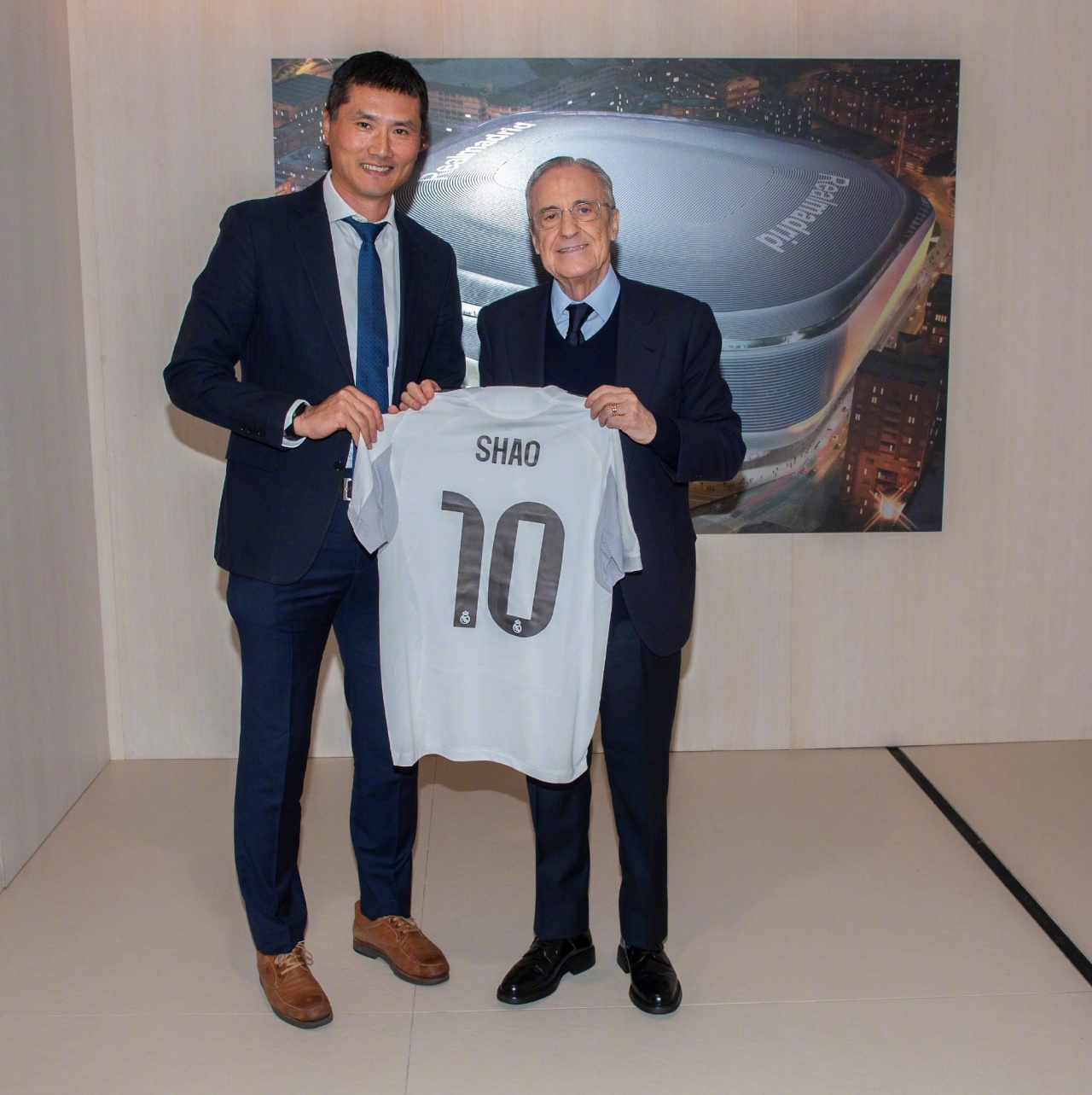 星空体育团队-国足主帅邵佳一到访皇马,与弗洛伦蒂诺合影+获赠10号球衣